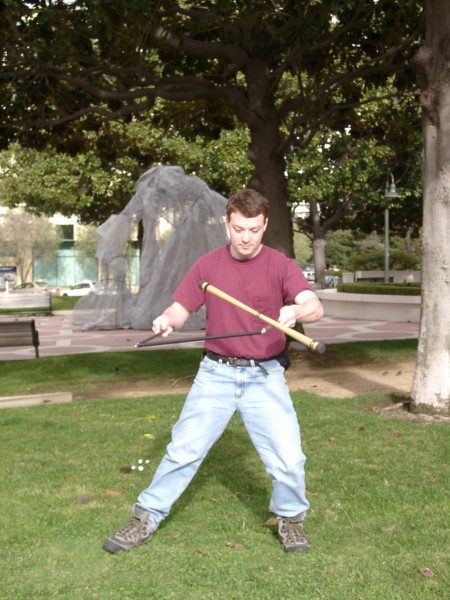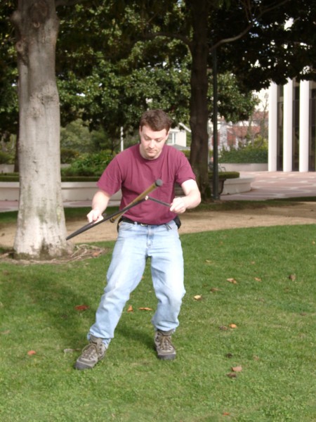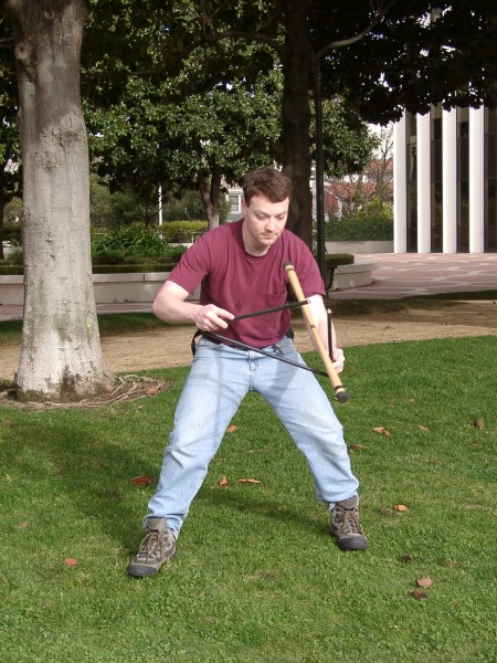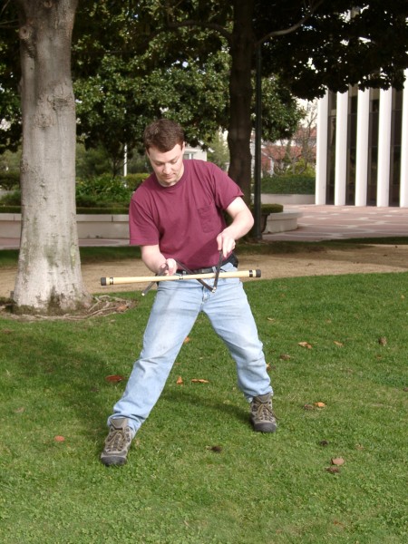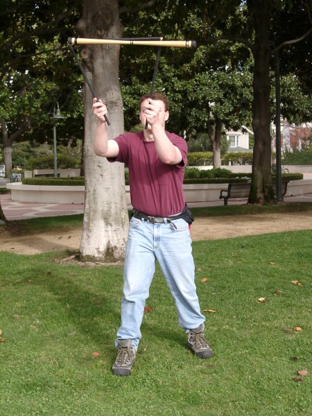 The 3-sectioned handstick was made by simply attaching three normal handsticks using eye screws and zip ties. The zip ties break after not too long, but they're cheap to replace and it's an easy way to make a prototype. These photos were taken by Steve Bogart.